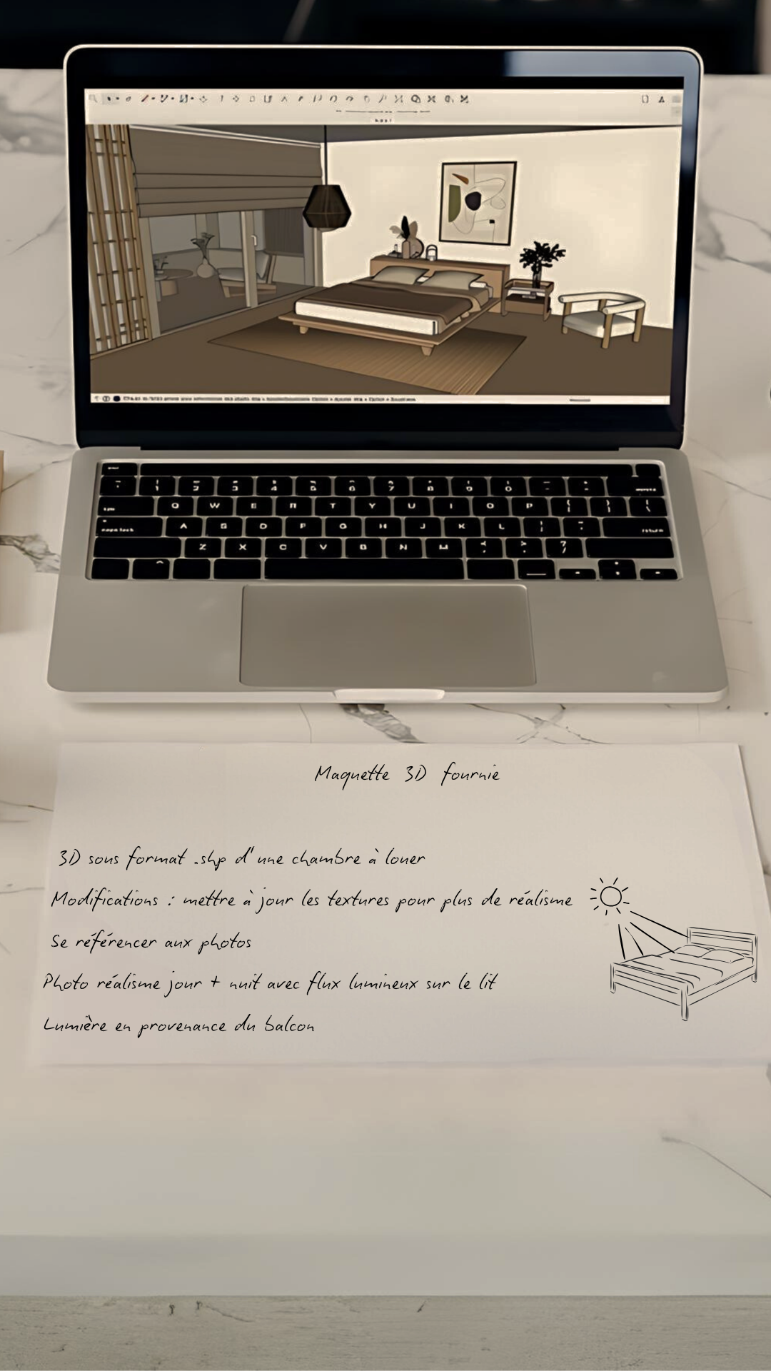 Lorsque vous disposez d'une maquette 3D compatible avec SketchUp (sous formats SKP, DWG, DXF, 3DS, etc.), nous entamons la phase de révision pour apporter des modifications ou des ajouts selon vos besoins spécifiques.