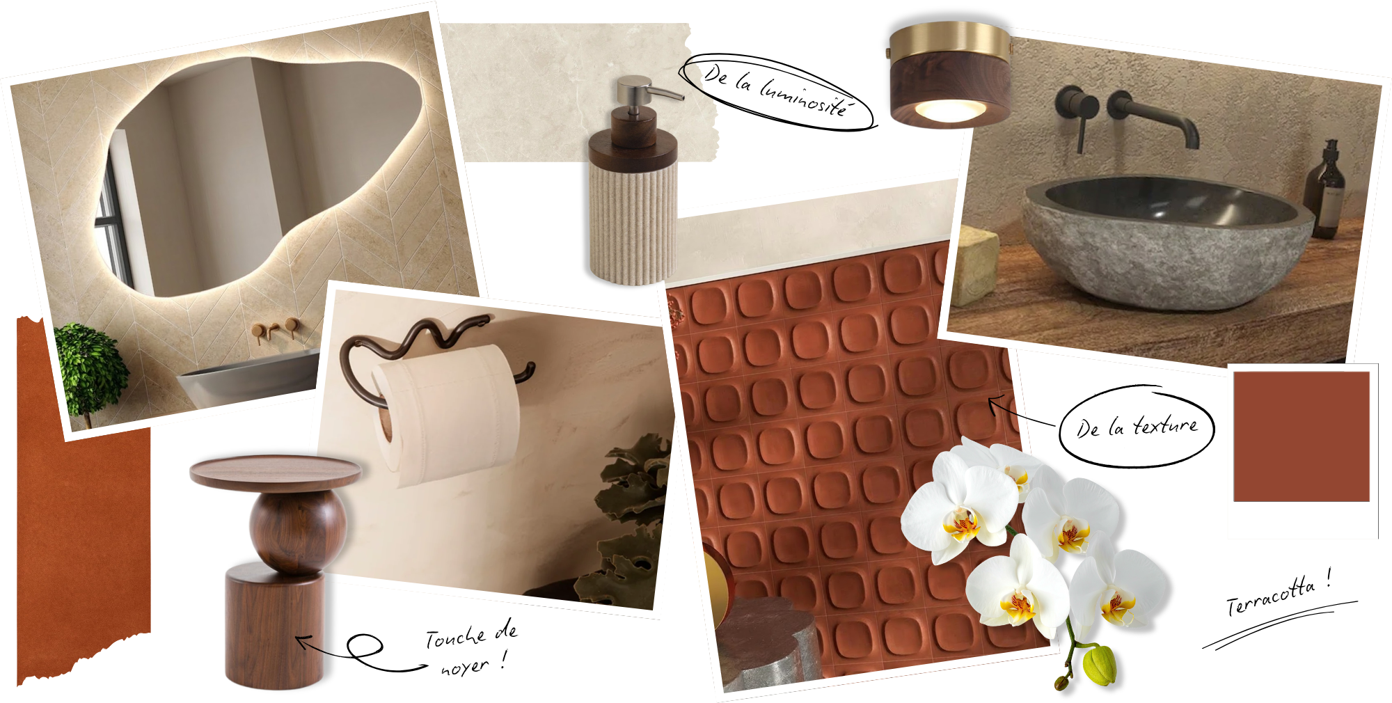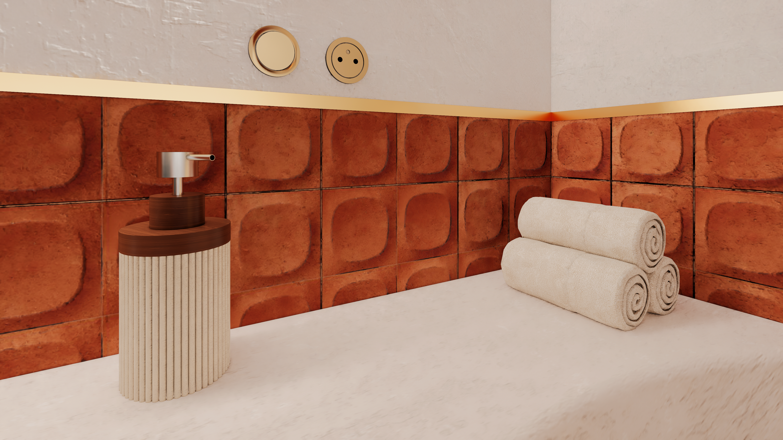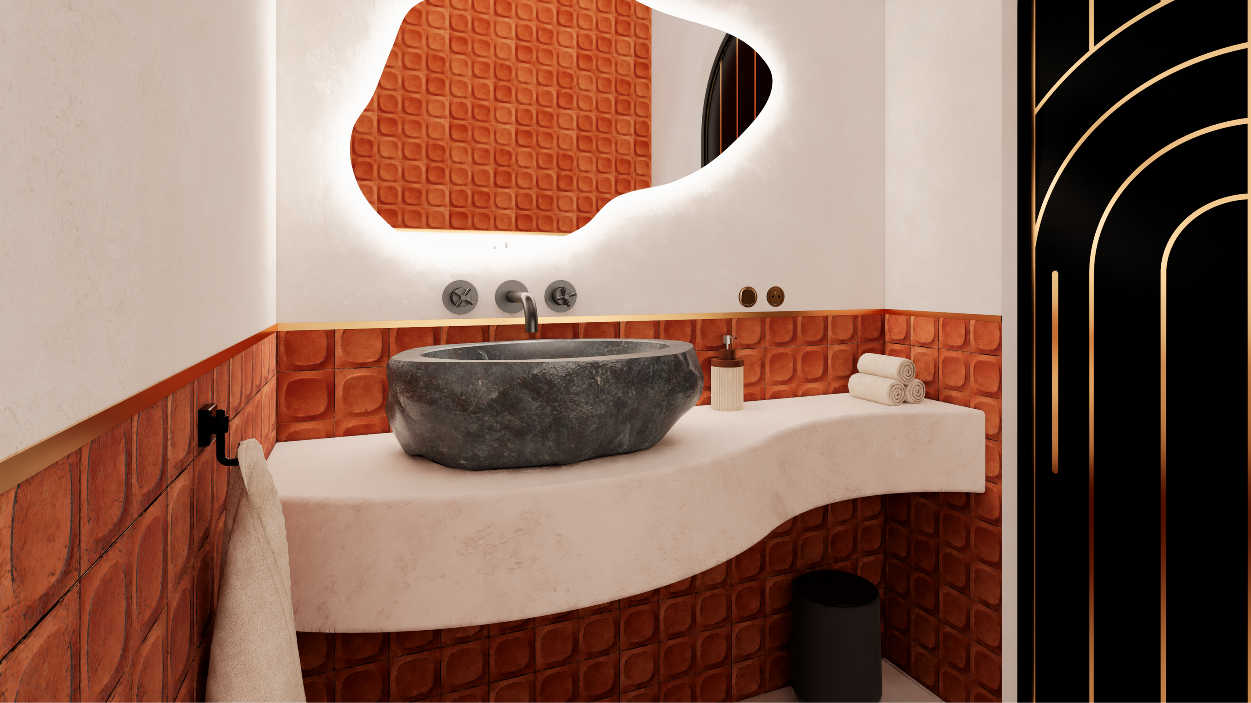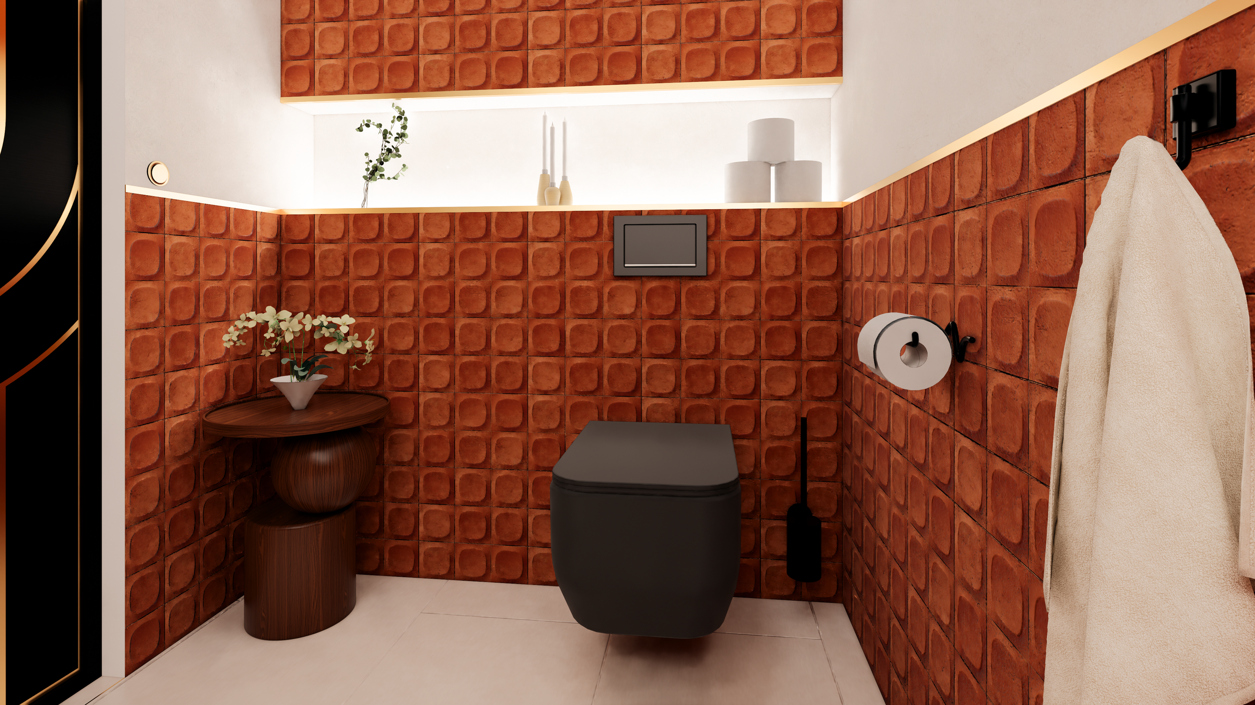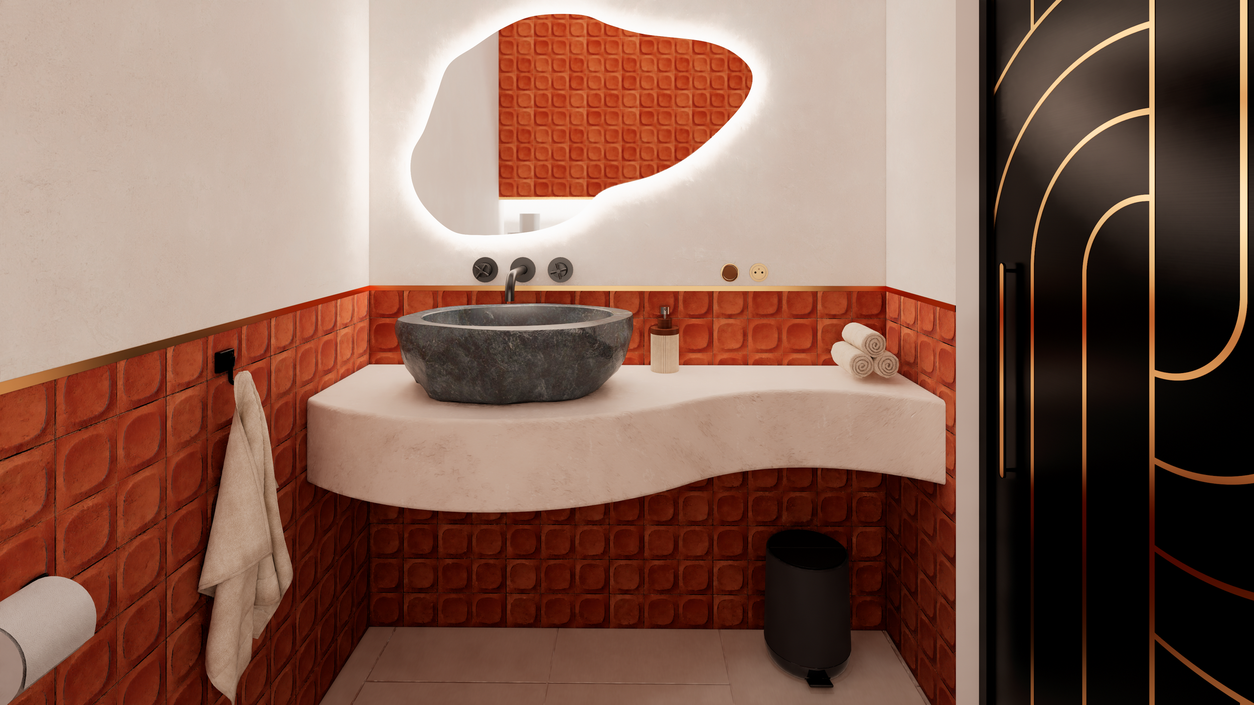 Même les plus petits espaces participent à l’identité du projet. Les WC, rouge et beige, offrent une atmosphère chaleureuse et raffinée, où chaque détail a été pensé avec soin.